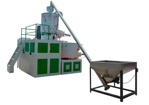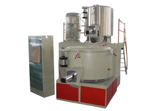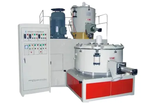 Двухстадийный смеситель состоит из нескольких важных узлов. В горячем миксере композиция перемешивается до момента получения однородного состояния. Температура внутри оборудования при этом превышает 100 градусов. Дно миксера оснащено специальными лопастями, где ПВХ смешивается с мастербатчем и мелом.